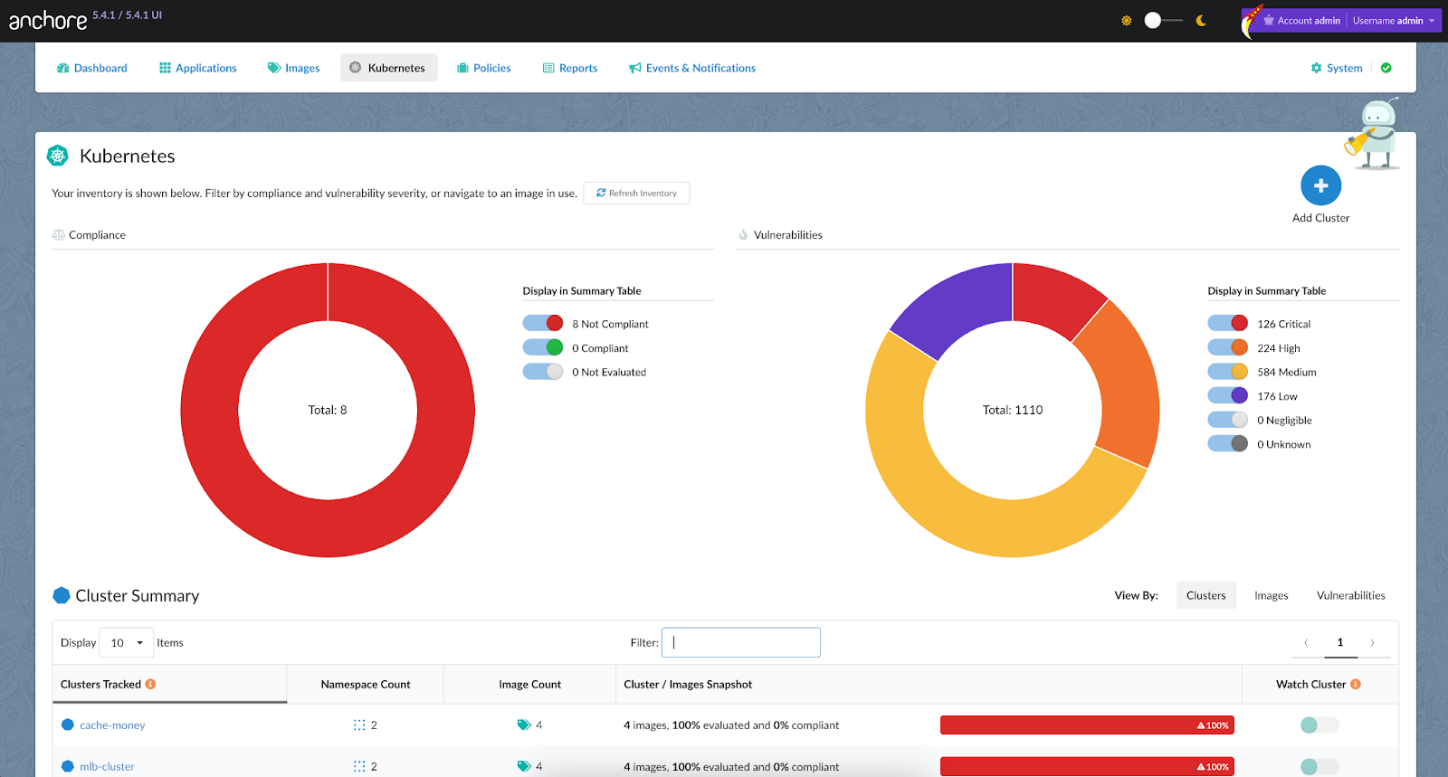 The Anchore Federal UI provides dashboards summarizing vulnerabilities and your compliance posture across all your clusters. You can drill down into the details for an individual cluster or namespace and filter the dashboard. For example, selecting only high and critical vulnerabilities will only show the clusters and namespaces with those vulnerabilities.